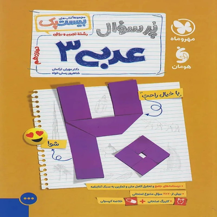 کتاب پرسوال عربی دوازدهم مهروماه بیست پگ از مجموعه کتابهای جدید با نام پرسوال مهروماه ویژه دانش آموزان مقطع دوازدهم رشته ریاضی و رشته تجربی به قلم در انتشارات مهروماه تولید و منتشر شده است. این کتاب کمک آموزشی شامل خلاصه درسنامه کامل درس به درس مطابق با کتاب درسی جدید به همراه تعدادی سوال متنوع امتحانی از خط به خط کتاب درسی با پاسخنامه تشریحی در کنار آزمونهایی شبیه به امتحان نهایی مدارس می باشد. از ویژگیهای بیست پک پرسوال عربی دوازدهم مهروماه موشکافی و تحلیل متون کتاب درسی در بخش درسنامهها با هدف ارتقا و ترمیم معدل به جهت دستیابی به 60% نمره قبولی در کنکور سراسری دانشگاههاست. همچنین در این بسته کتابچه خلاصه کپسولی و کاربرگ امتحانی عربی دوازدهم نیز ارائه شده است.