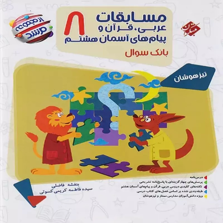 کتاب مسابقات عربی، قرآن و پیام های آسمانی هشتم مرشد مبتکران ویژه دانش آموزان مقطع هشتم دوره اول متوسطه، توسط انتشارات مبتکران منتشر شده است. این کتاب کمک درسی که جزو مجموعه مرشد به شمار می آید، توسط خانم ها بنفشه فاضلی و سیده فاطمه کریمی کسوتی برای استفاده دانش آموزان مدارس ممتاز و تیزهوشان نوشته شده است. کتاب مسابقات عربی و قرآن و پیام های آسمان هشتم مرشد مبتکران شامل درسنامه خلاصه و کاربردی به صورت درس به درس مطابق با کتاب درسی بههمراه پرسشهای چهارگزینهای با پاسخنامه تشریحی می باشد. از ویژگی های مهم کتاب پیش رو ارائه نکات کلیدی و طبقهبندی مطالب بر اساس فصول کتاب درسی است.